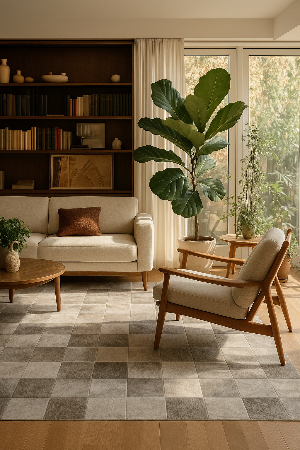 - Living Room: Anchor your layout with a large patchwork cowhide rug in taupe or grey. Pair it with linen sofas and wood tones for warmth without clutter.