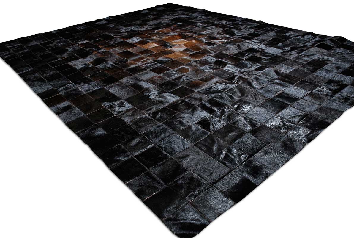 DESCRIPCIÓNPure Brown and Black Squares Patchwork Cowhide Rug in Square tiles. The fire-like gradient towards the center makes it the perfect focal point in any room!