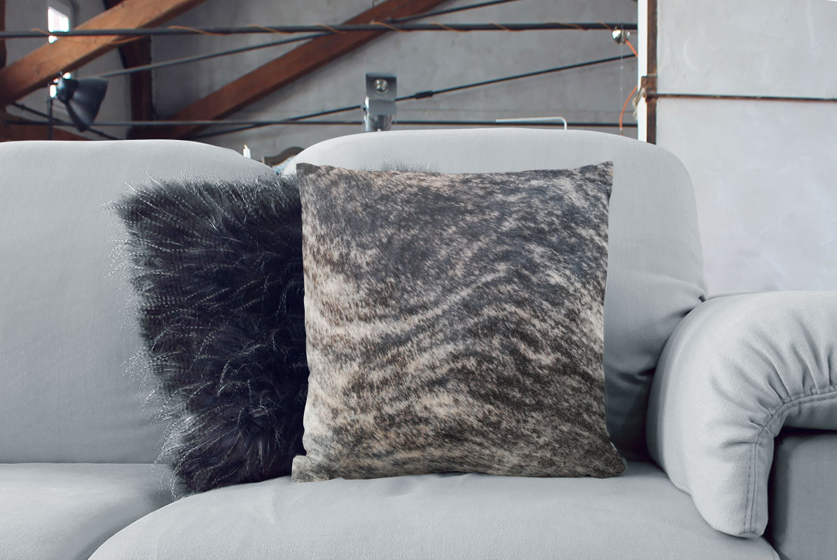 We hand selected this Dark Charcoal Brindle Hide just for this one special pillow, making this particular cushion a one-of-a-kind piece. The expressive tiger-like stripes in charcoal and beige makes it perfect for any space.
