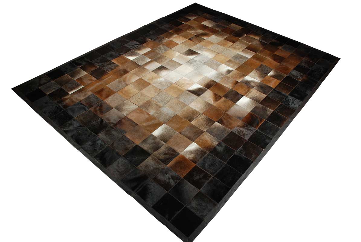 Beige, brown and black gradient patchwork cowhide rug in Squares. A classic pattern that comes to life with the intricate selection of natural hair-on-hide color.