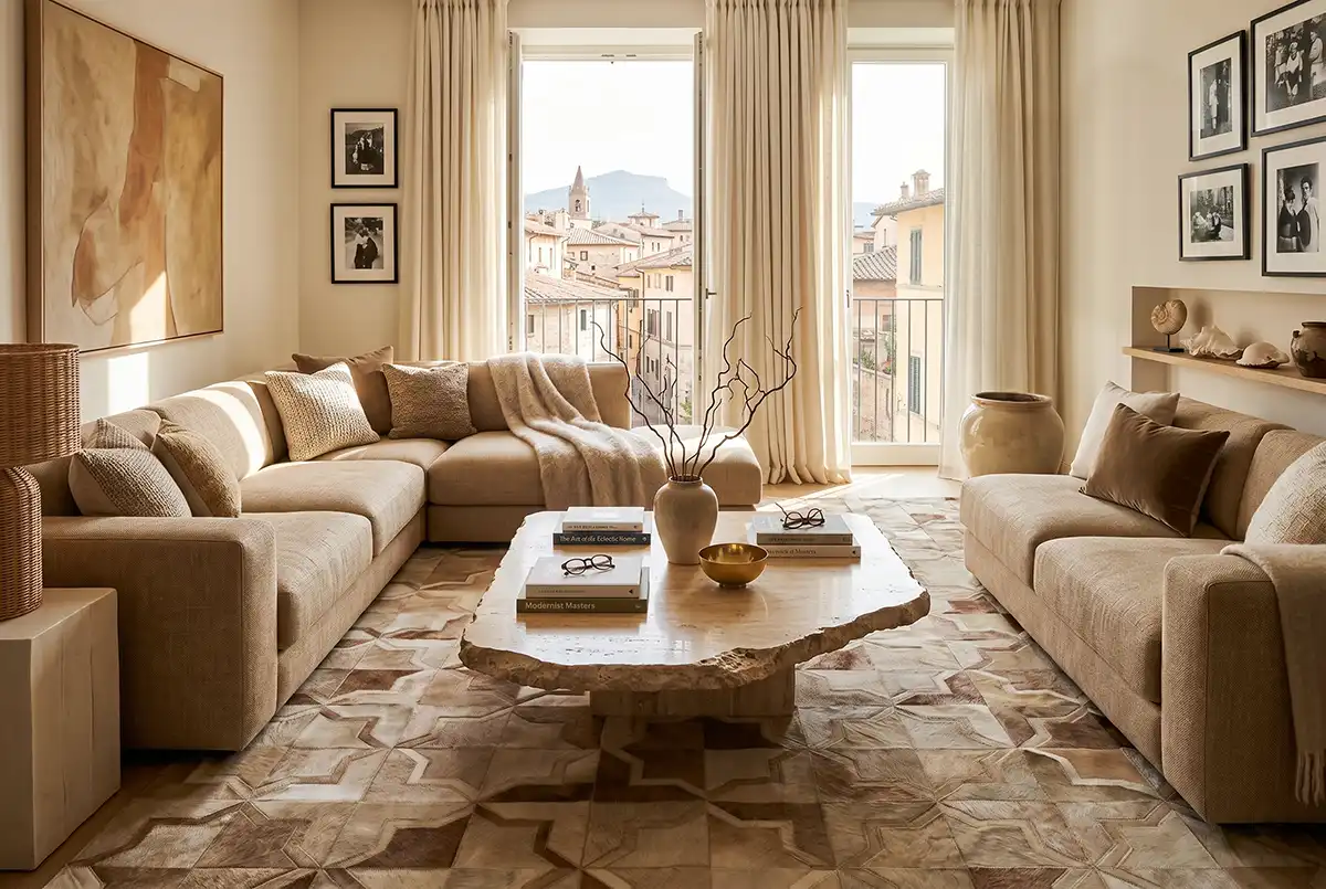 Each rug is made from 100% natural beige cowhides, carefully cut and assembled by hand to ensure consistency in tone while preserving the subtle variation that makes real hide unique. The result is a refined, architectural look that works especially well in modern, minimalist, and Scandinavian interiors.