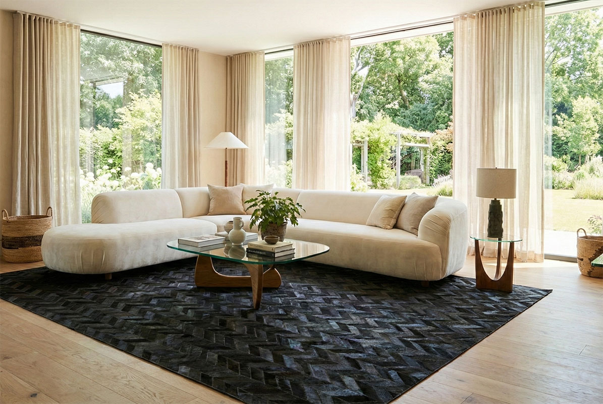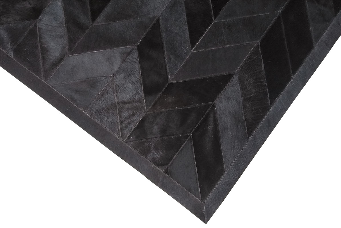 Bold Chevron lines and pure black cowhide create a striking statement for modern interiors.