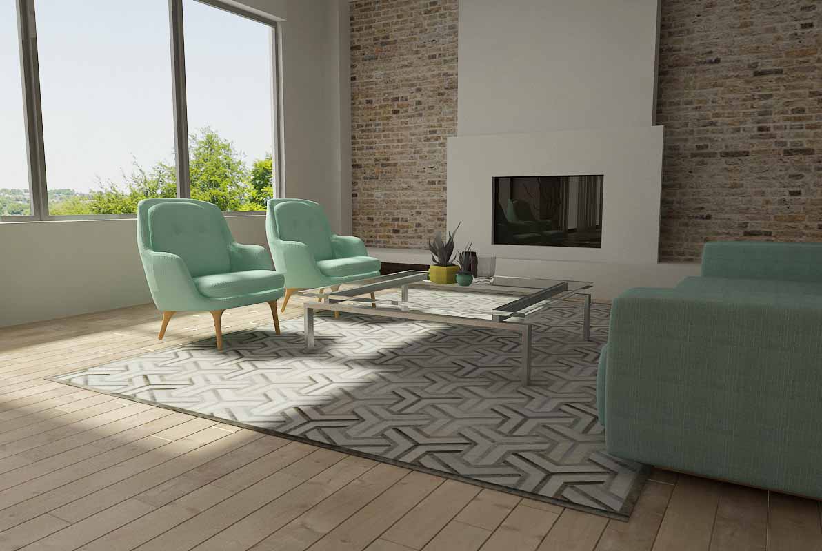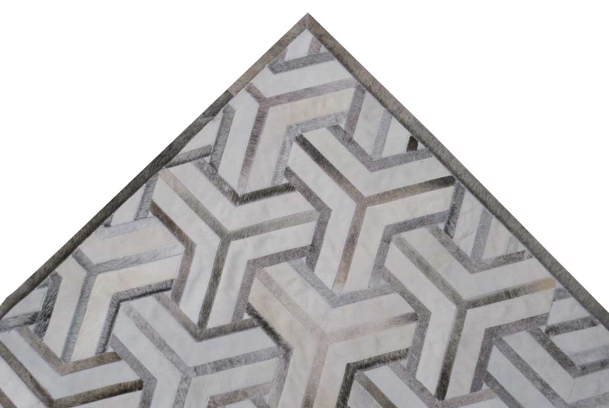 In this version, creamy white hides mingle with warm taupe and grey tones for a look that’s both subtle and graphic. Each patch is carefully cut, arranged and stitched to keep the pattern perfectly aligned.